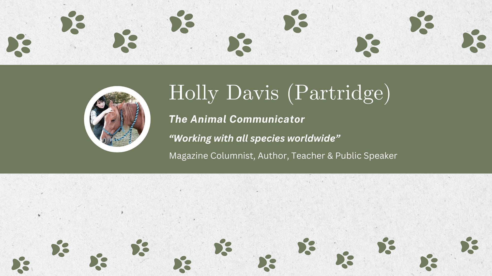 I got to know Holly Davis through our passion for animals and communicating with them. She has been a great support to me over the years - both professionally and personally, particularly when it was time for my greyhound Purdy to leave her body. What an amazing day that was - all compliments of Holly! If you're looking for some-one you can trust completely, look no further than Holly Davis.